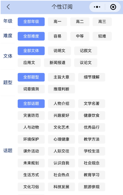 个性化订阅:根据年级、难度、文体、话题等分类阅读,学生可以根据自身水平进行选择,循序渐进的进行阅读,逐步积累词汇和语法内容,拓宽知识面。