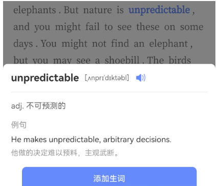 智能辅助:全文朗读音频,生词点击一下即可了解释义,还可以一键收藏到生词本,以便巩固练习。